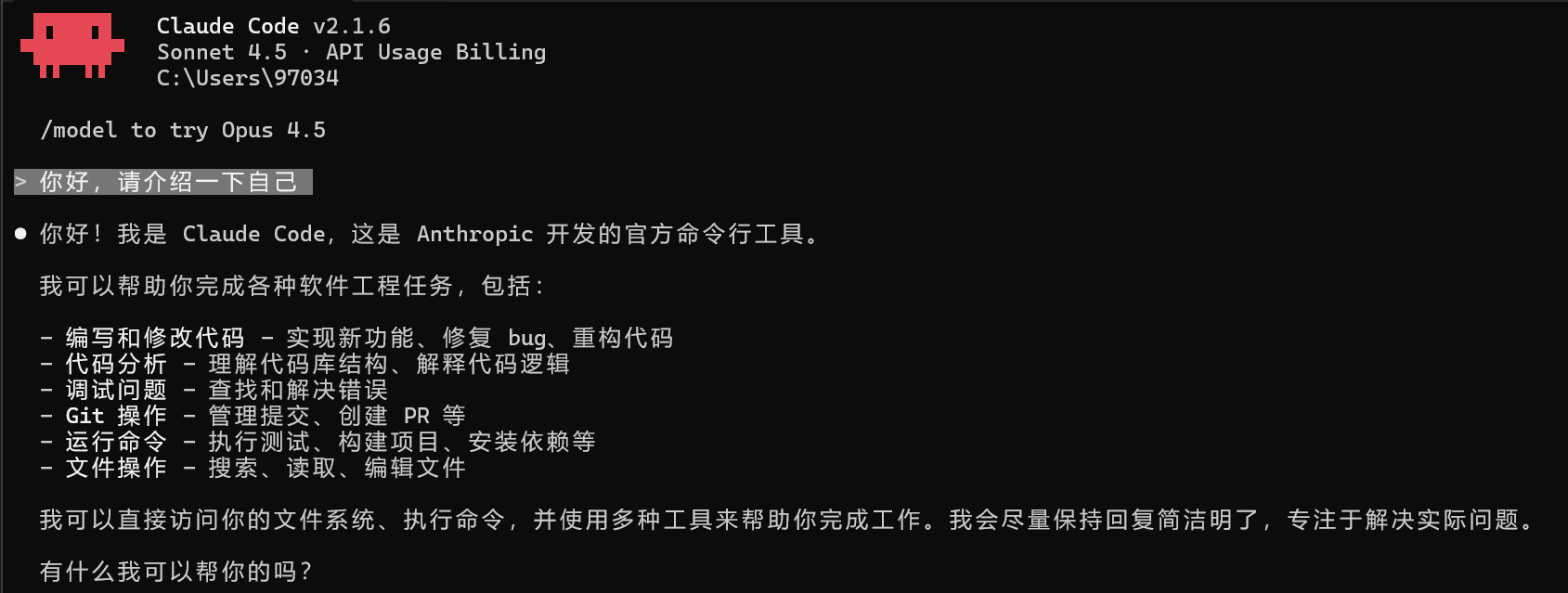 到这一步,Claude Code 就已经可以正常进入工作状态了。