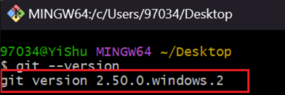 在 Git Bash 终端里输入 git --version 查看 git 版本,如图所示,说明 Git 安装成功。