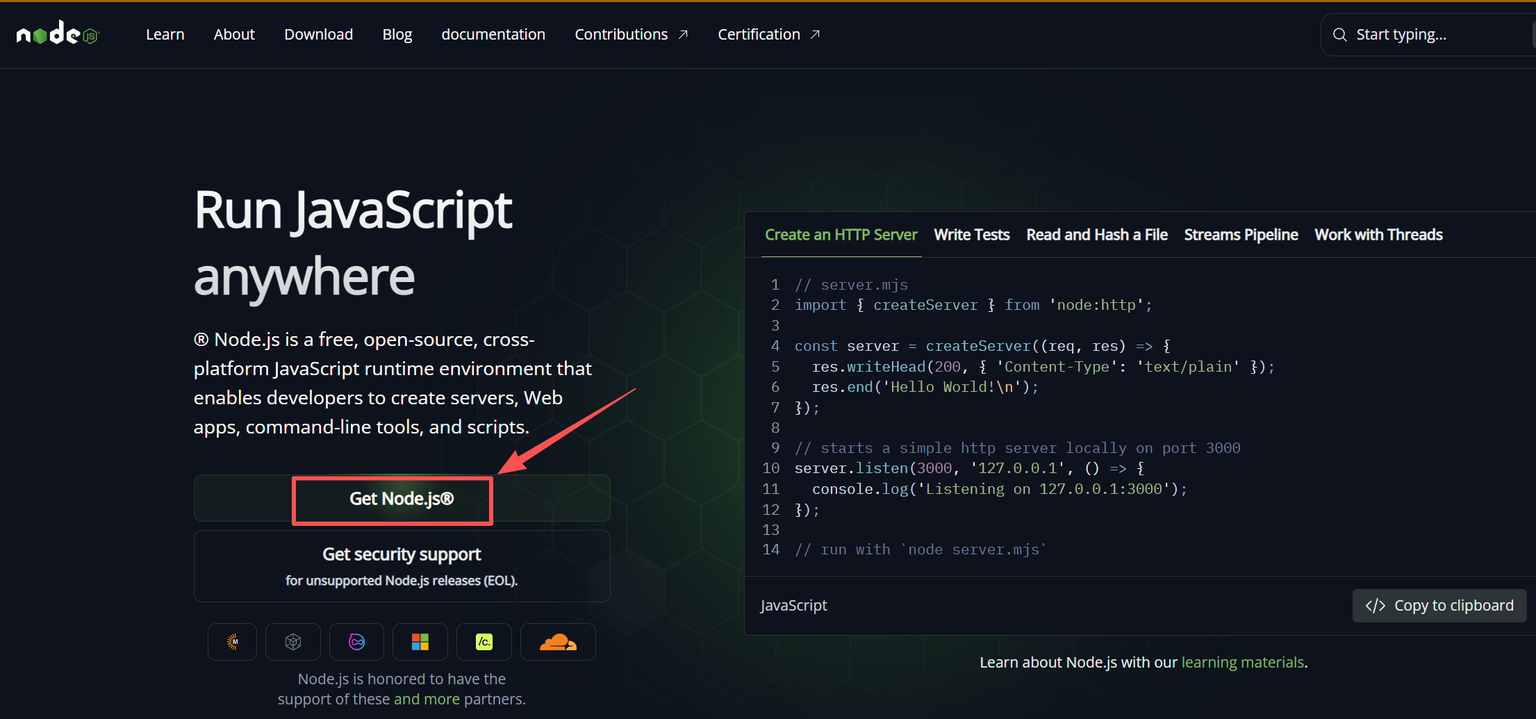 去 https://nodejs.org 下载,点绿色的"Get Node.js"按钮。之后根据自己系统下载 Node.js