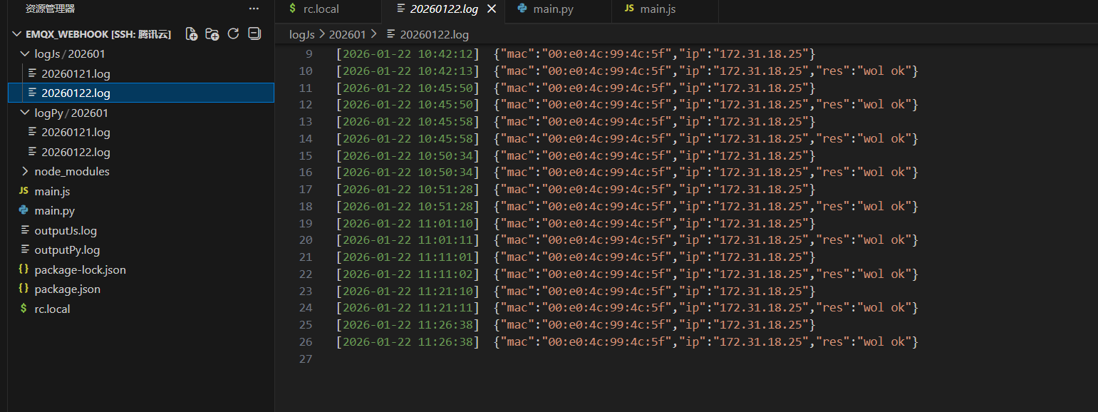 可以看脚本运行的效果outputJs.log、outputPy.log,mqtt转发的日志按照日期文件夹存放到相应的文件夹