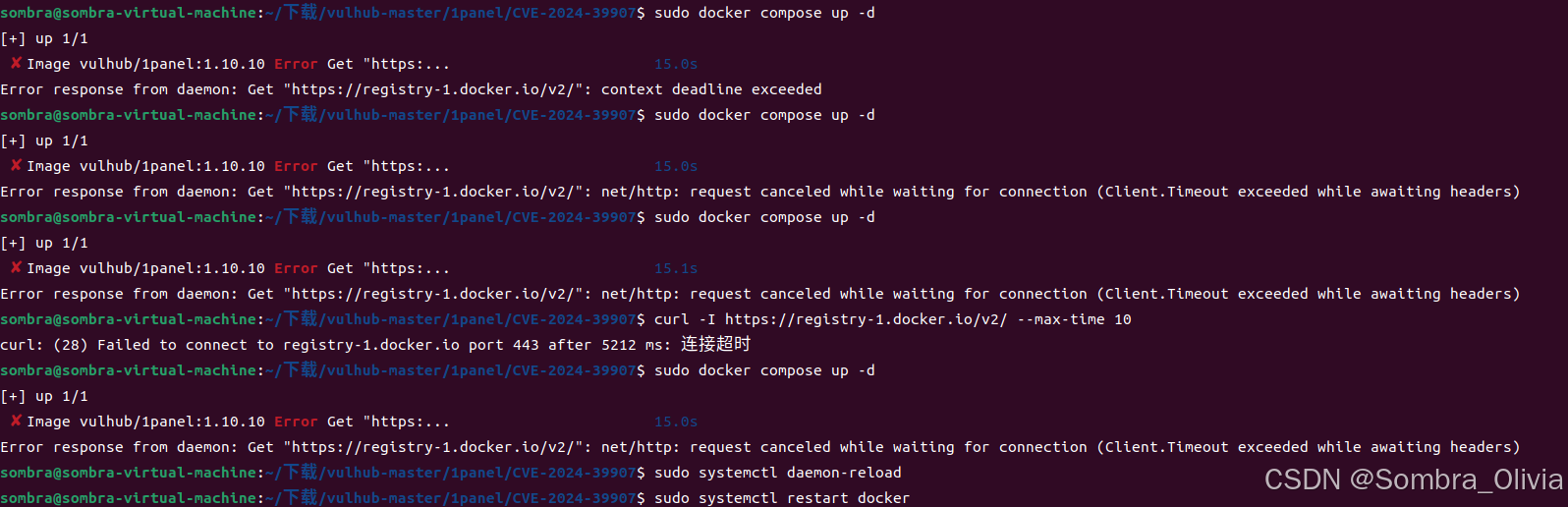 正常cd进入该漏洞下,使用命令就可以拉取镜像进行复现。但是,拉取镜像之后报错: