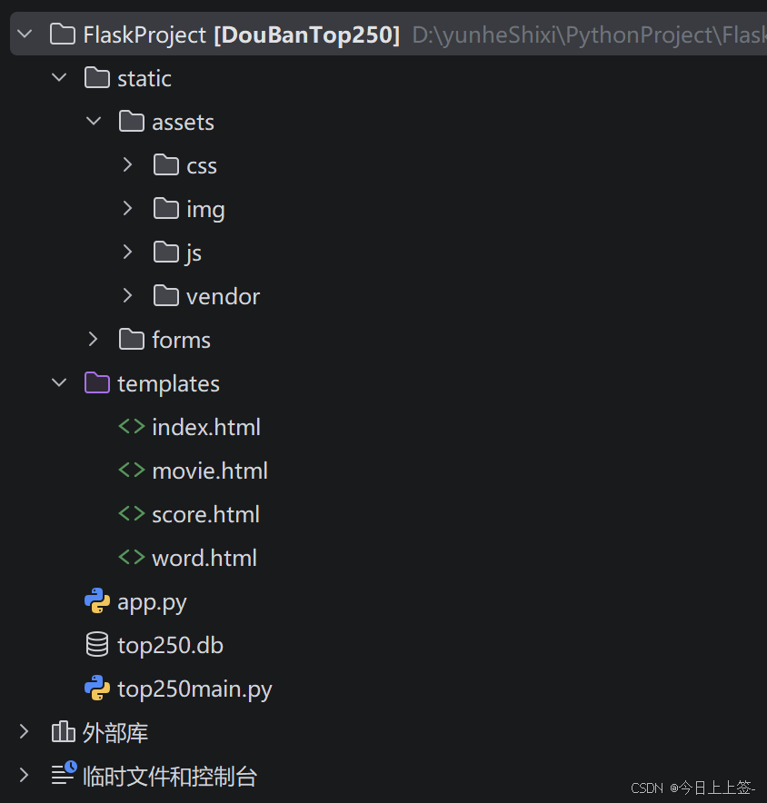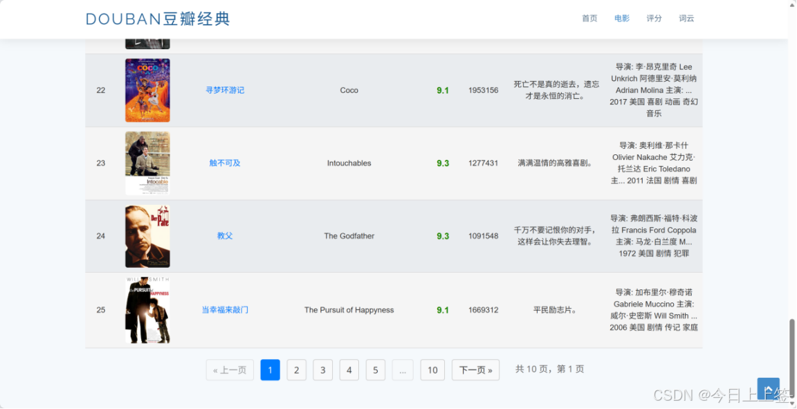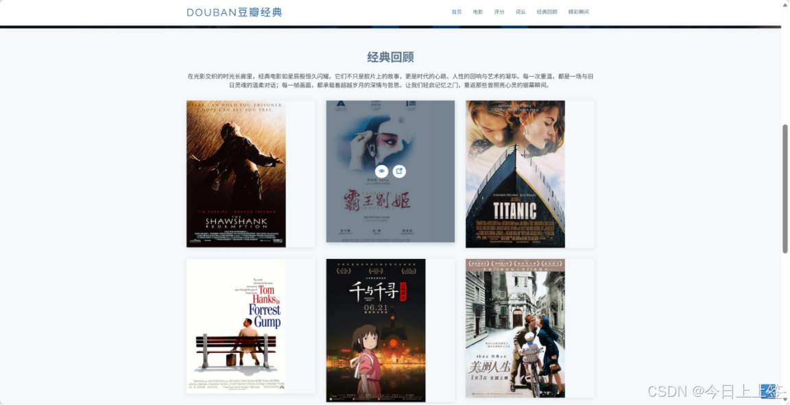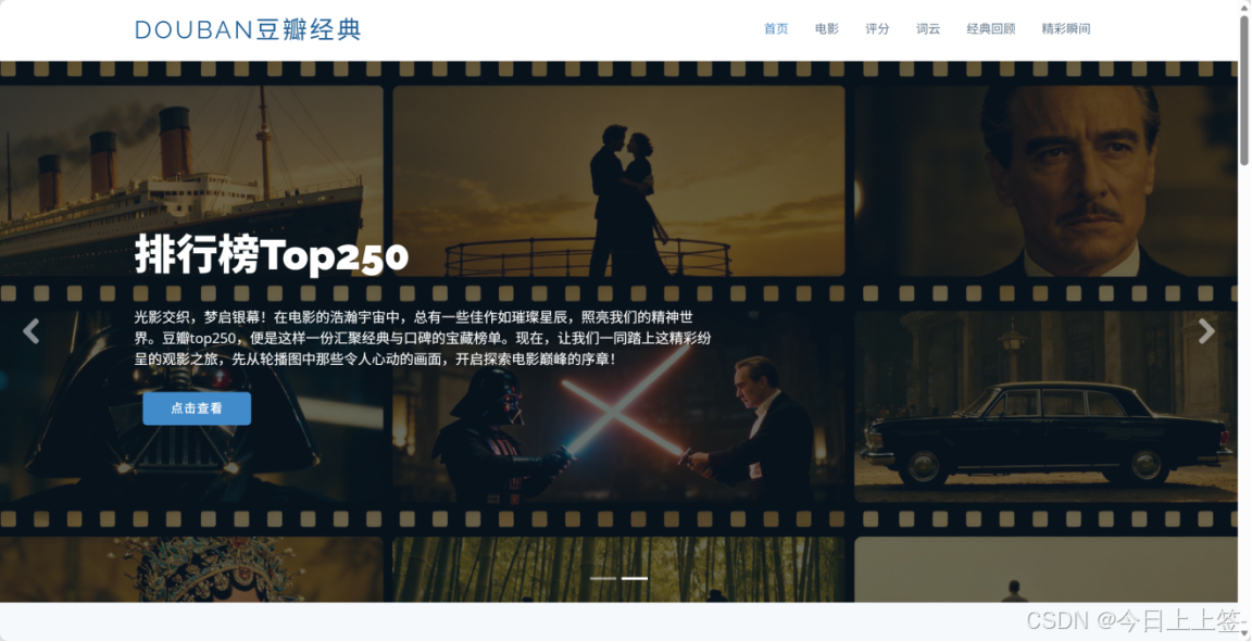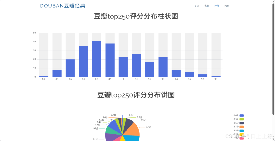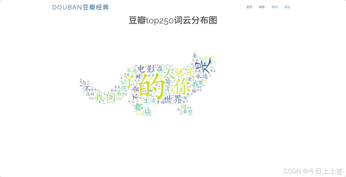 本项目成功爬取豆瓣电影Top250的完整信息,涵盖电影排名、名称、评分、评价人数和一句话概述等核心数据,并将数据持久化存储到Excel文件和SQLite数据库中。基于Flask框架搭建的Web应用实现了四大核心功能模块:首页展示项目简介与热门电影推荐、电影列表页呈现完整Top250电影信息、评分分布页通过Echarts可视化展示不同评分区间的电影数量与占比、词云页生成以猫咪图片为背景的电影名称高频词汇云图,全方位满足用户对电影信息的浏览、查询和分析需求。