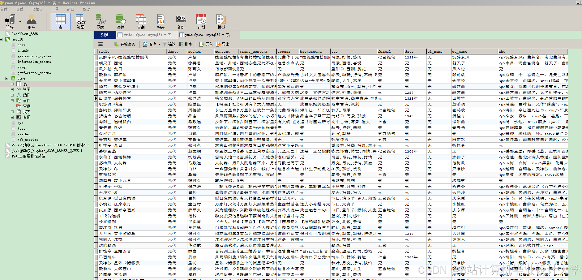 中华古诗词是中华文化的瑰宝,现存唐诗超5万首、宋词超2万首,蕴含着丰富的历史、地理、情感与哲学信息。然而,传统诗词研究依赖人工标注与文本分析,难以挖掘诗词间的隐性关联(如诗人间的师承关系、地域与题材的映射规律)。知识图谱技术通过结构化存储诗词、诗人、朝代、意象等实体及其关系,结合Python强大的数据处理与可视化能力,可实现诗词知识的深度挖掘与直观呈现。