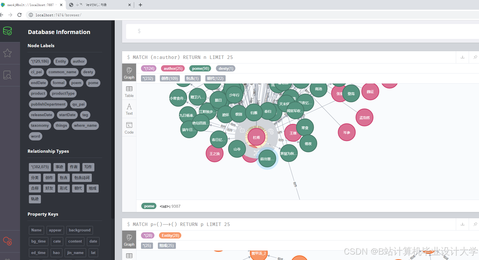 - 知识融合:使用Neo4j图数据库的Cypher语言合并重复实体,解决数据异构问题。例如,将不同来源的"李白"实体合并为单一节点,并关联其诗词、师承关系等属性。
