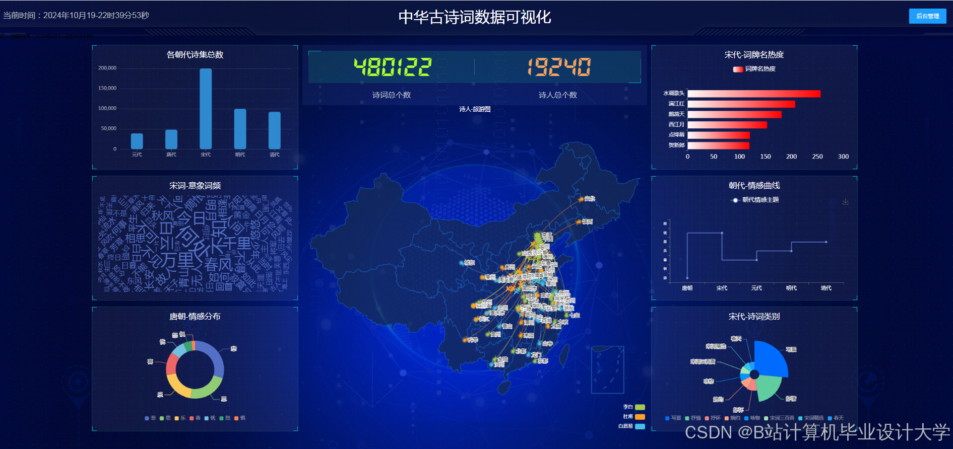 - 地理映射:结合Folium库将诗词创作地标注在地图上,通过热力图展示地域分布规律。例如,唐代诗词创作热点集中在长安、洛阳,宋代则南移至临安(今杭州)、苏州。