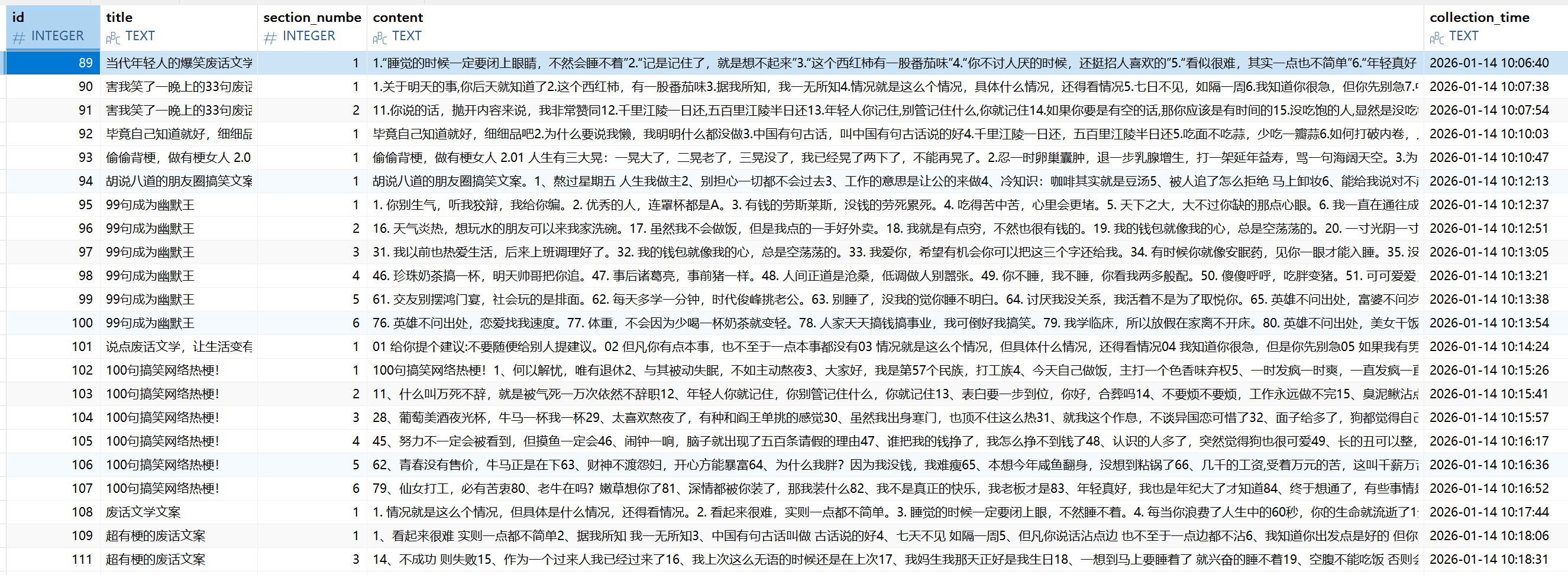可以看到,content字段里面是一段一段的话,通过序号分隔,并且有的content还包括了文档的标题,这时我们需要把每段话单独分隔出来,通过AI生成一段python脚本,这一步不要照抄,每个人获取的数据不同,清洗方式也不同