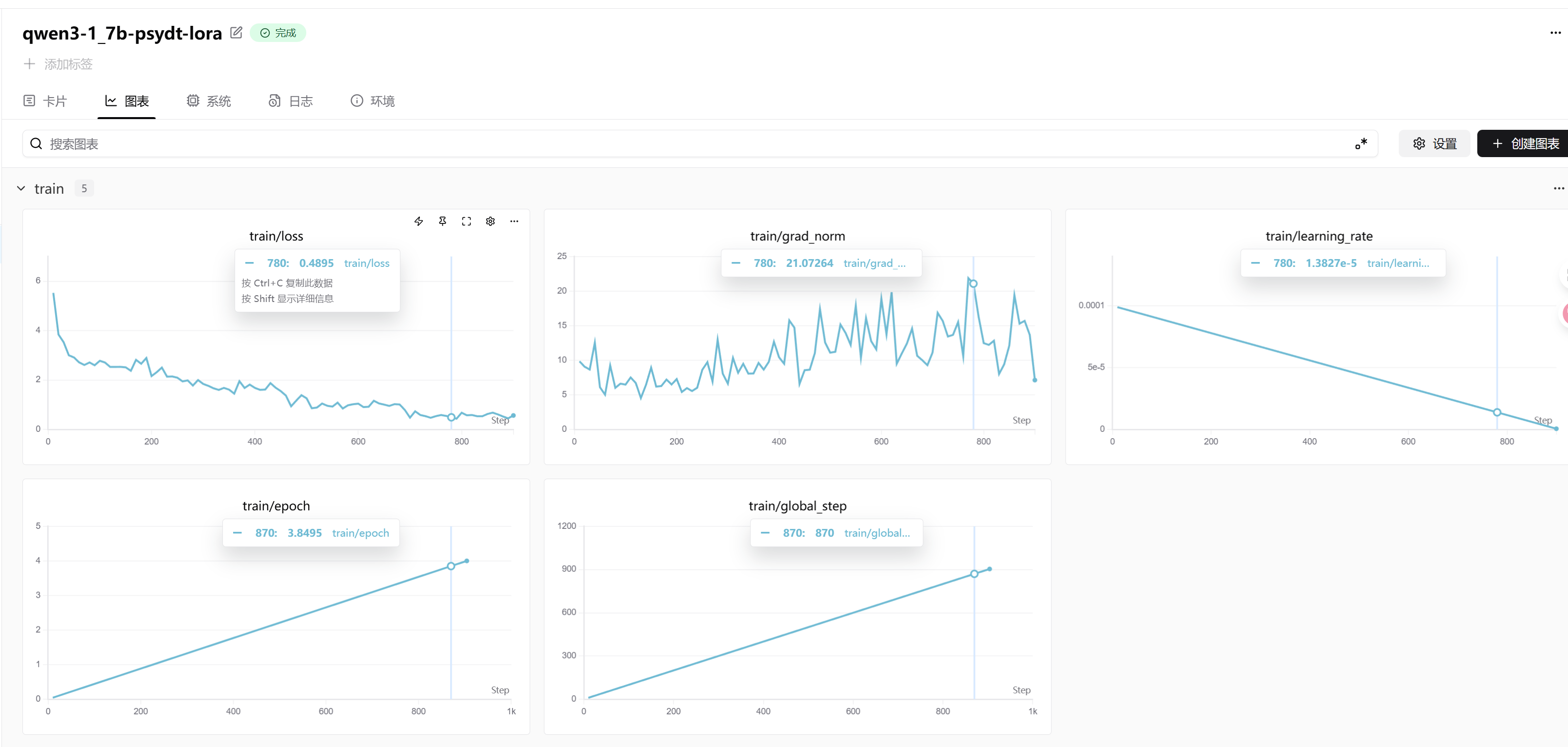 由于我们使用了swanlab记录了训练过程,我们可以在它的界面看到本次训练的过程,通过这个界面可以判断出模型是否收敛,是否发生了过拟合