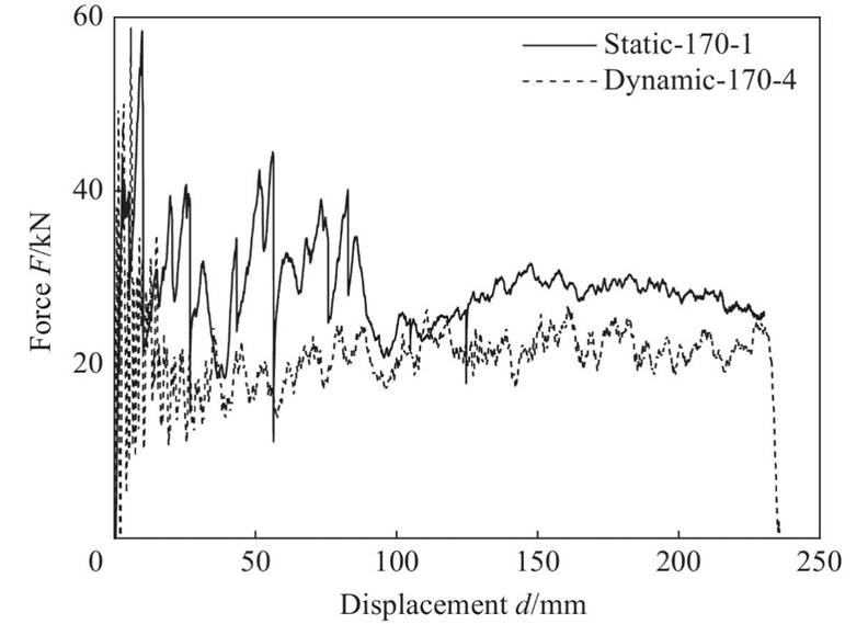 为了验证T700/T800级碳纤维复合材料作为主体结构材料的实际力学适配性,通过静态与动态加载测试可直观体现其在载荷作用下的力-位移响应特性,对应测试曲线如图3-8所示。在该图中,实线(Static-170-1)与虚线(Dynamic-170-4)分别对应该碳纤维材料在静态、动态加载工况下的力学表现,曲线所体现的高承载能力(载荷峰值可达60kN级)与稳定的力-位移响应规律,恰好印证了其"高拉伸模量、高比强度"的核心性能优势,也为将其作为主体结构材料的选型决策提供了实测数据支撑。