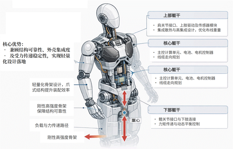 人形机器人躯干结构如图3-6所示,躯干是连接四肢、承载核心部件(电池、控制器、传感器)并传递运动力矩的关键载体,其结构设计的核心矛盾是刚度与灵活性的平衡、集成效率与维护便捷性的取舍。