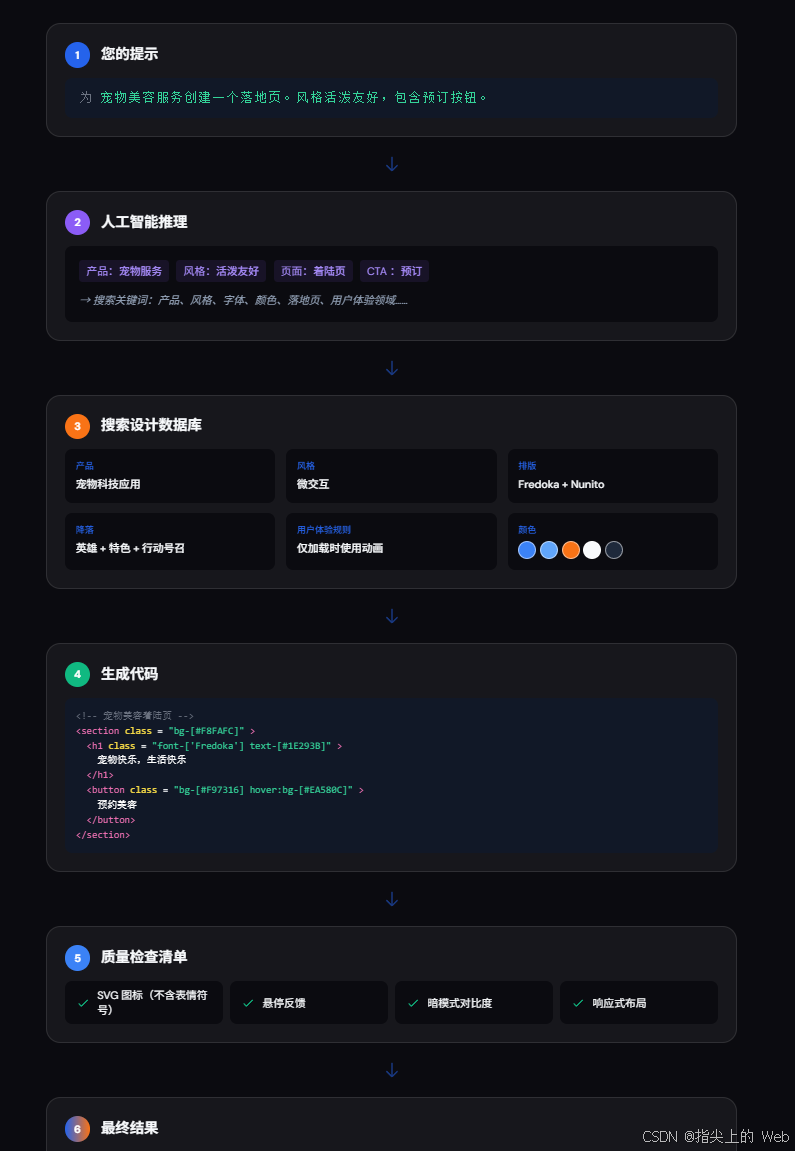 UI UX Pro Max 采用了一套创新的推理机制,只需 6 个步骤即可将自然语言提示转化为可用于生产的 UI 代码。