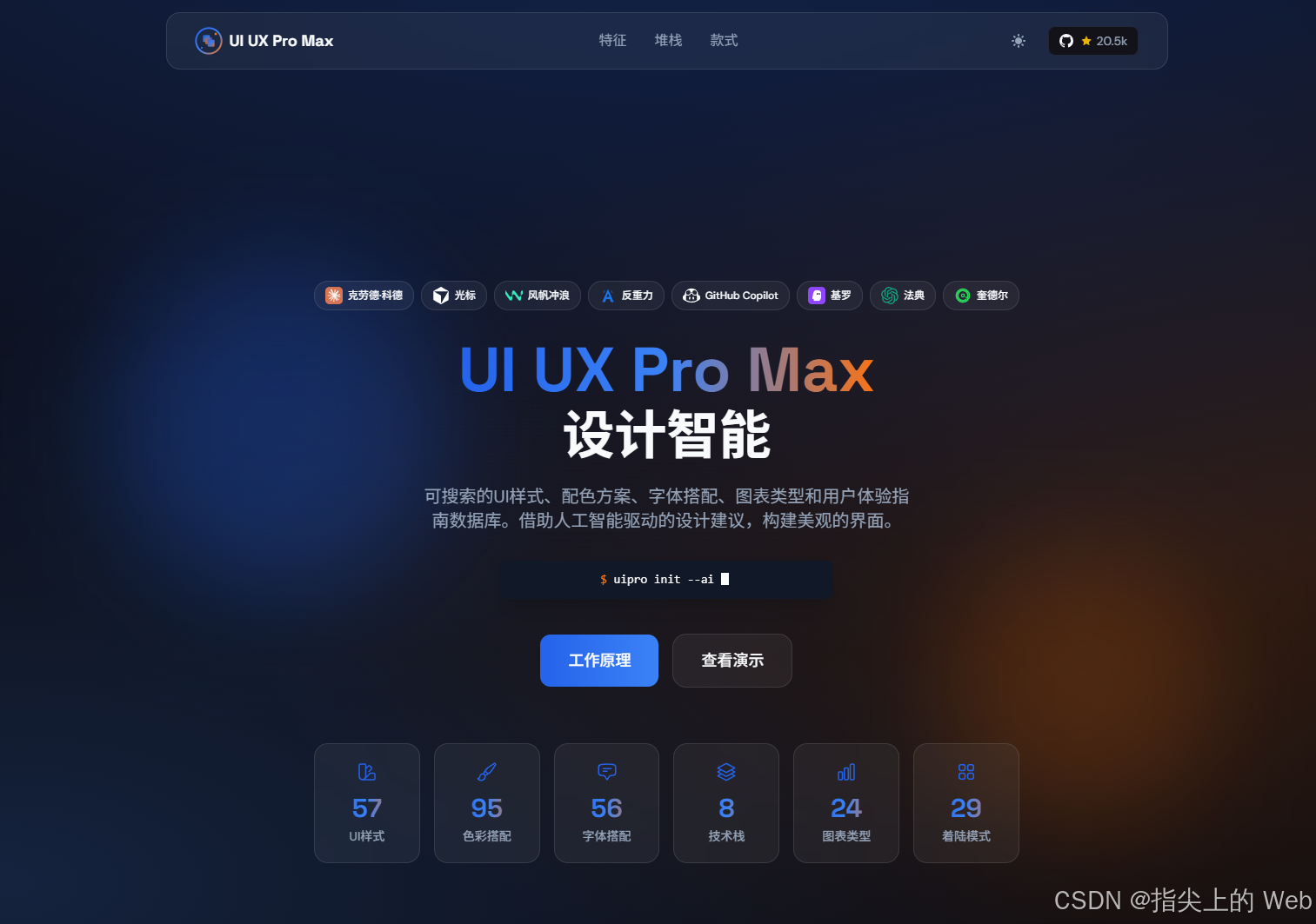 在现代前端开发中,设计系统的构建往往需要大量的时间和专业知识。从色彩搭配、字体选择到组件设计,每一个决策都需要深思熟虑。UI UX Pro Max 的出现改变了这一切------它是一个基于 AI 推理引擎的设计智能工具,能够根据产品类型自动生成完整的设计系统,并输出生产级代码。
