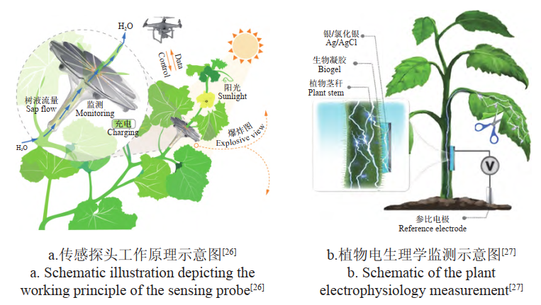 图 3 可穿戴智能农业传感器监测作物案例 Fig.3 Case study on monitoring crop with wearable smart agricultural sensorsa. 传感探头工作原理示意图 [26](Schematic illustration depicting the working principle of the sensing probe [26])b. 植物电生理学监测示意图 [27](Schematic of the plant electrophysiology measurement [27])