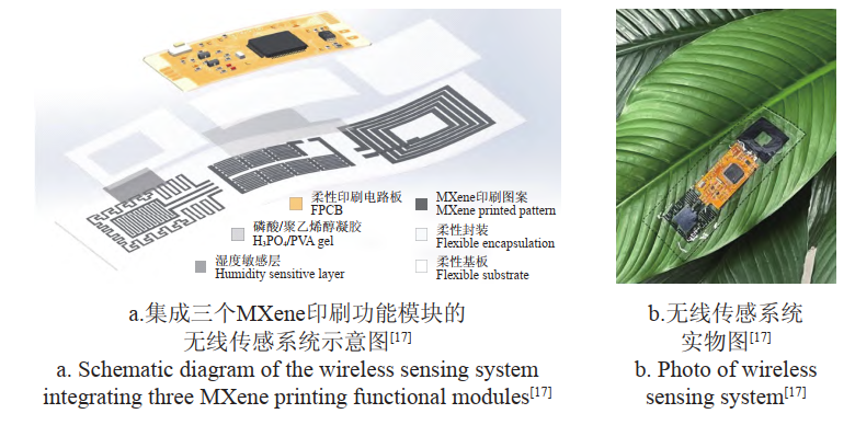 图 2 智能农业传感器用于作物叶片温湿度监测案例 Fig.2 Case study on monitoring crop leaf temperature and humidity with smart agricultural sensora. 集成三个 MXene 印刷功能模块的无线传感系统示意图 [17](Schematic diagram of the wireless sensing system integrating three MXene printing functional modules [17])b. 无线传感系统实物图 [17](Photo of wireless sensing system [17])注:柔性印刷电路板(FPCB)、柔性封装(Flexible encapsulation)、柔性基板(Flexible substrate)、湿度敏感层(Humidity sensitive layer)、MXene 印刷图案(MXene printed pattern)、磷酸 / 聚乙烯醇凝胶(H3PO4/PVA gel)