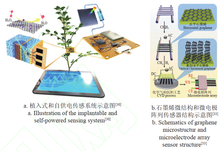 图 4 植入式智能农业传感器监测作物生理案例 Fig.4 Case study on monitoring crop physiological with implantable smart agricultural sensorsa. 植入式和自供电传感系统示意图 [30](Illustration of the implantable and self-powered sensing system [30])b. 石墨烯微结构和微电极阵列传感器结构示意图 [33](Schematics of graphene microstructure and microelectrode array sensor structure [33])注:微电极阵列(Microelectrode array)、化学气相沉积工艺(CVD process)、对电极(CE)