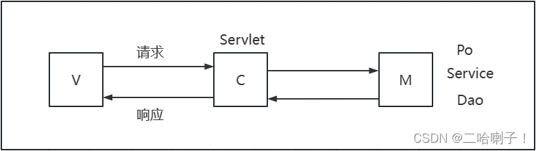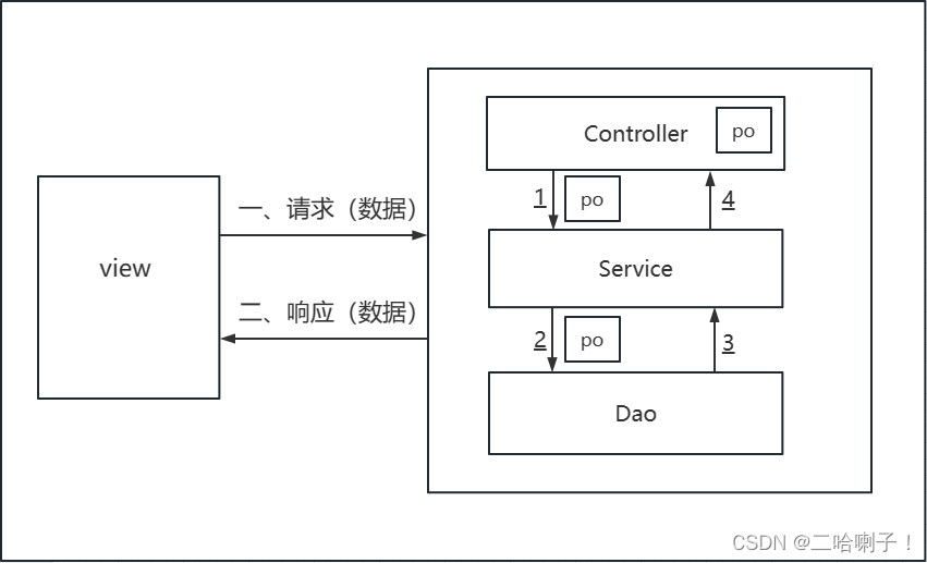 前端向后端发请求,后端controller接到请求后request.getParameter()取出数据,数据多的话封装到 po中,封装完后 service 处理请求,处理过程中设计数据库调用 dao,dao处理完后有结果了,结果给 service ,再给 controller,controller 根据结果再生成响应给前端