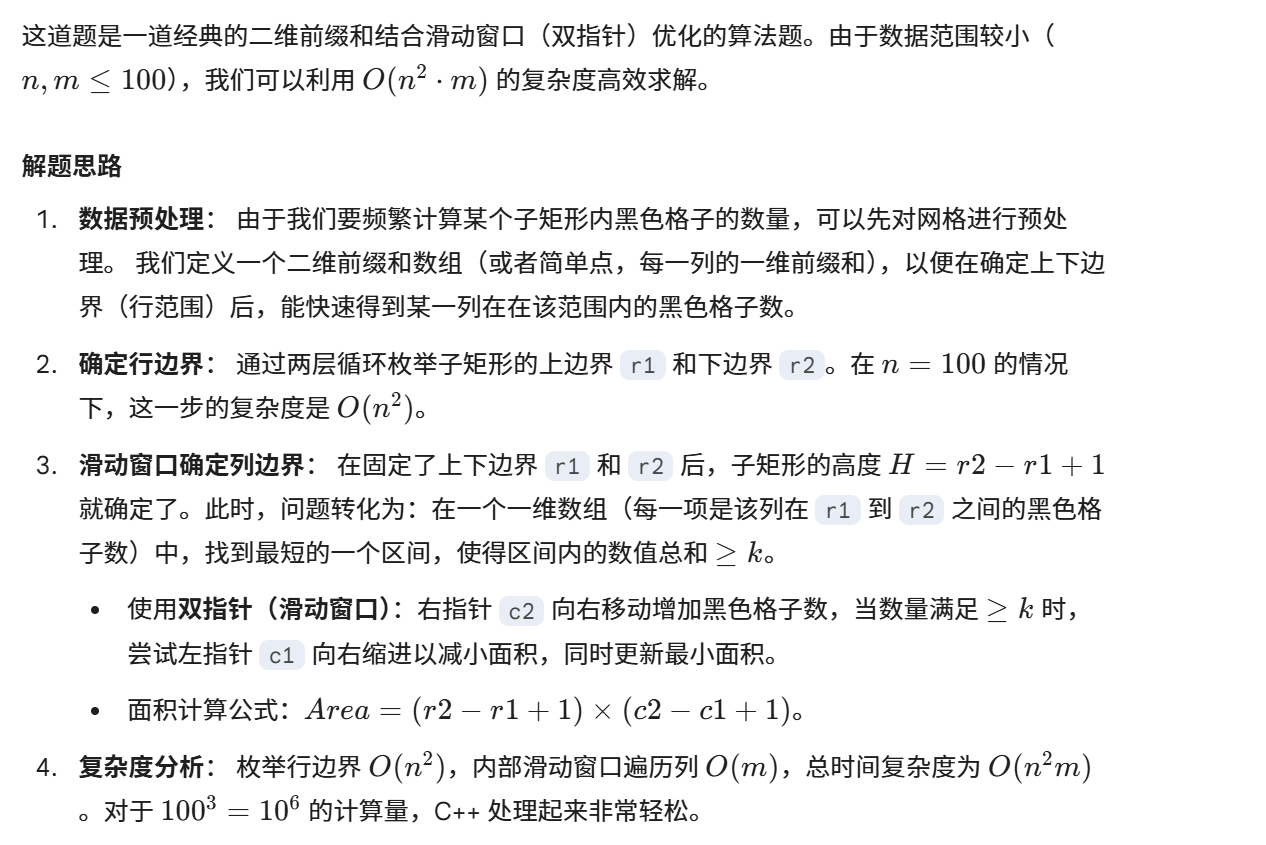 // 当黑格子总数 >= k 时,尝试收缩左边界 l 以减小面积