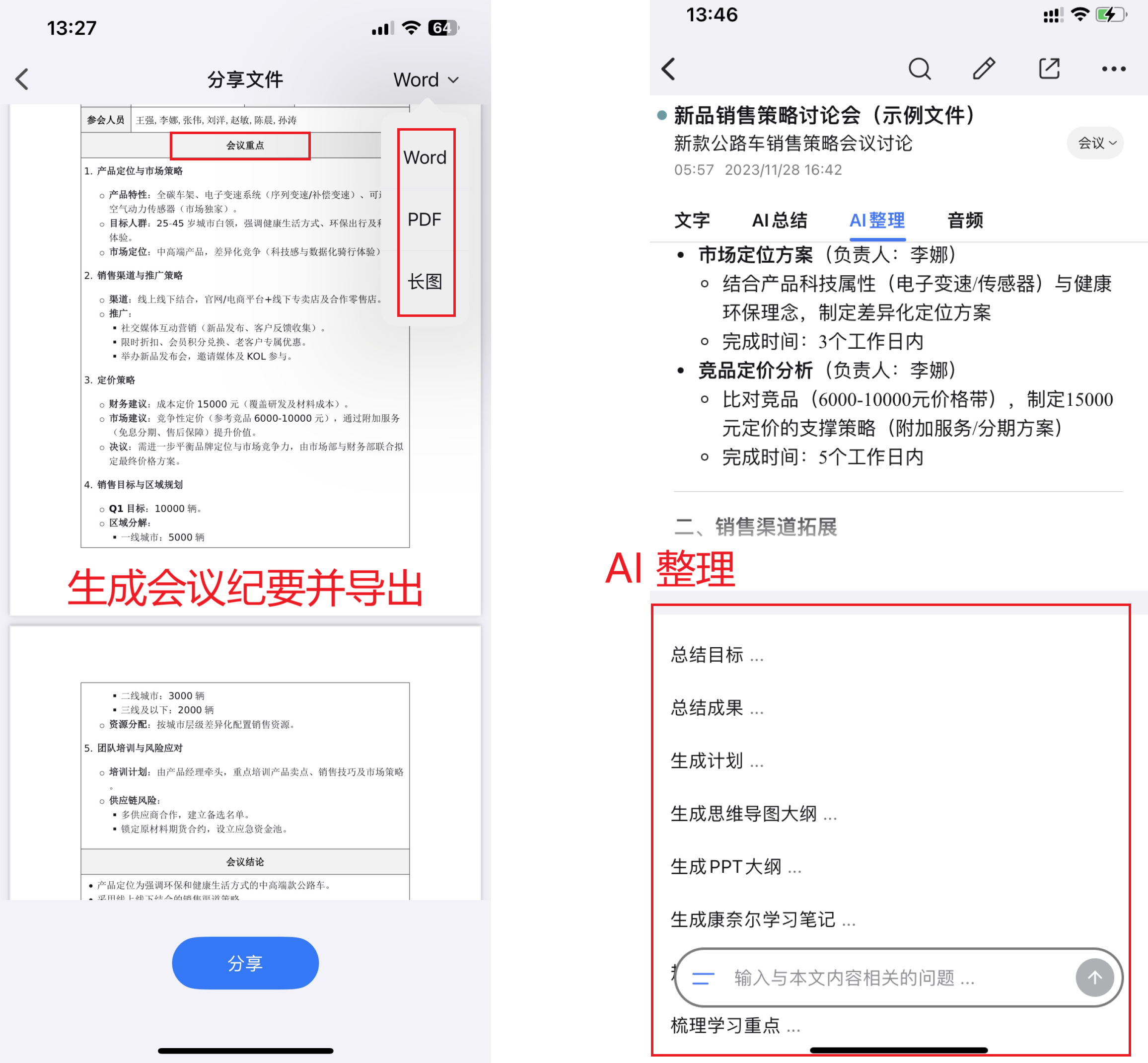 - 面试结束后:停止录音 → 查看自动生成的转写文本(已区分说话人) → 点击"AI整理" → 选择"生成会议纪要"或"康奈尔学习笔记" → 一键导出为Word/PDF/链接分享,或存入"春招2026"分组