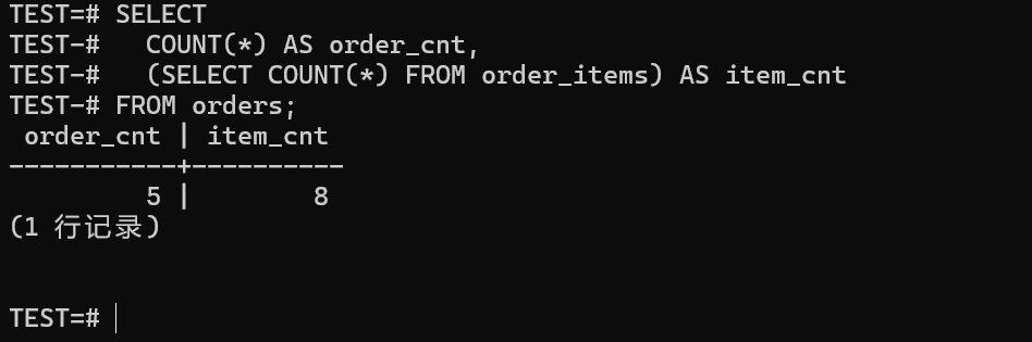 (SELECT COUNT(*) FROM order_items) AS item_cnt
