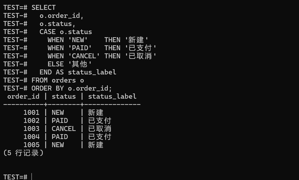 - [6.3.2 用 CASE 映射订单状态(DECODE 场景的等价改写)](#6.3.2 用 CASE 映射订单状态(DECODE 场景的等价改写))