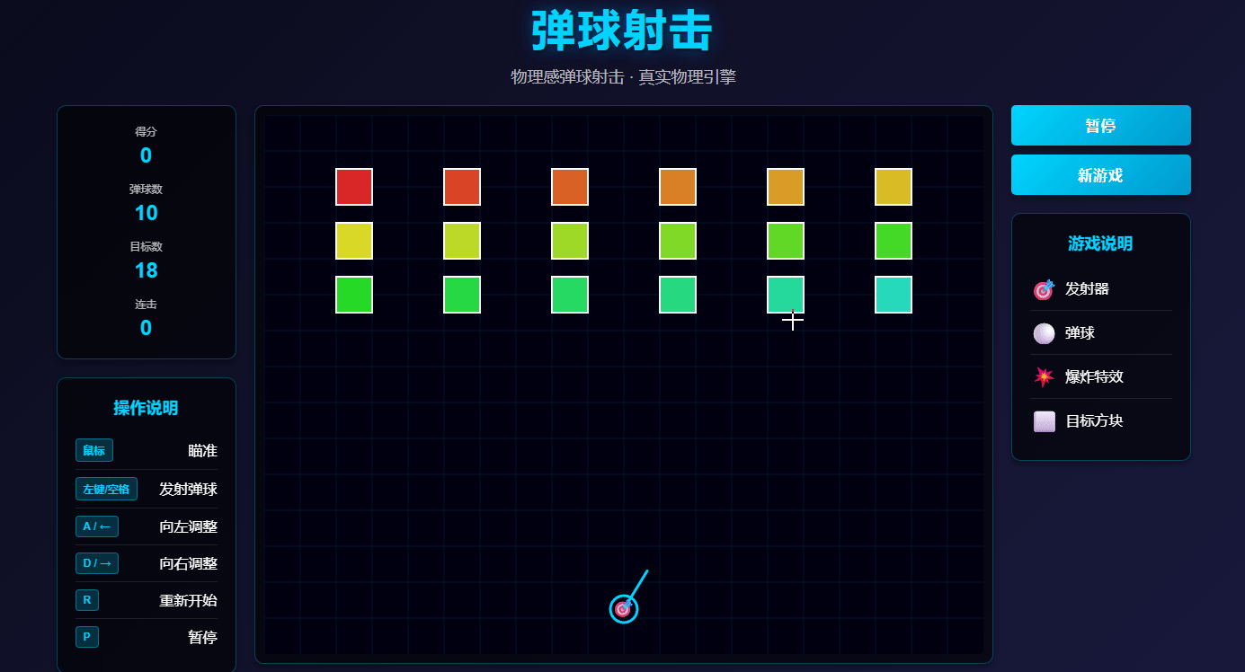 弹球射击是一款基于HTML5 Canvas的物理引擎游戏,玩家通过鼠标瞄准和键盘控制,发射弹球击碎屏幕上方的目标方块。游戏融合了真实的物理模拟、动态视觉特效和沉浸式音效系统,提供了丰富的游戏体验。