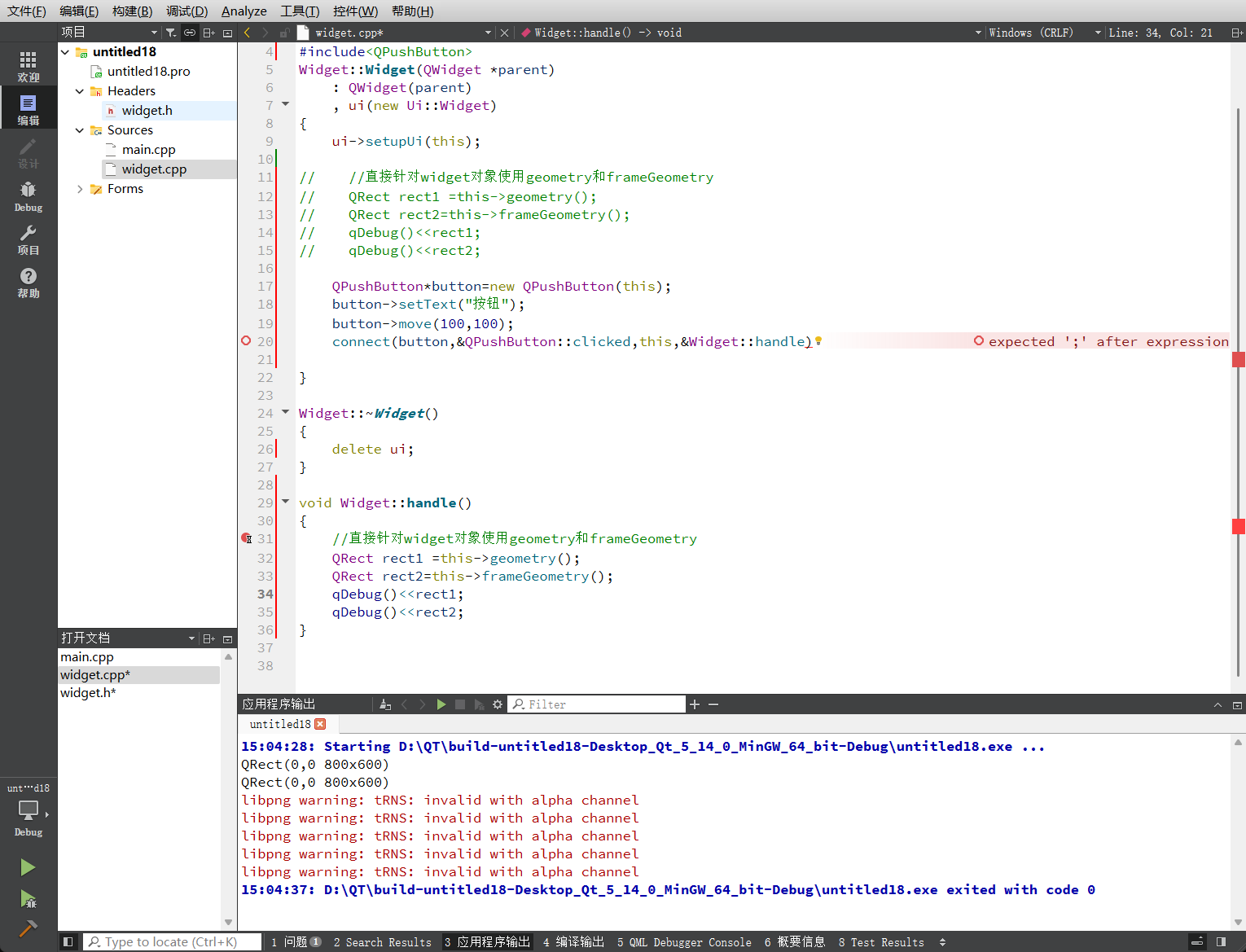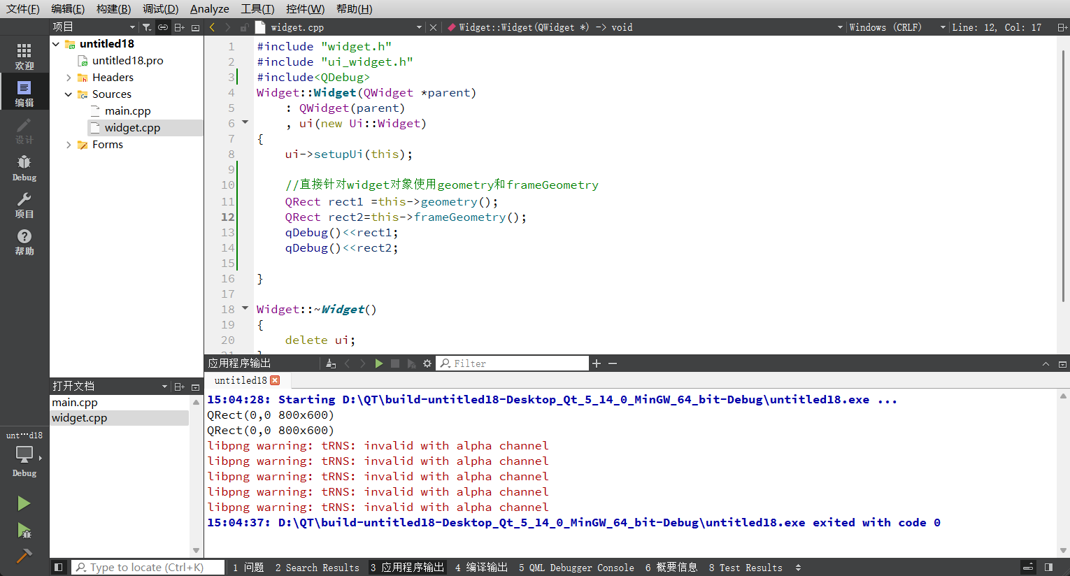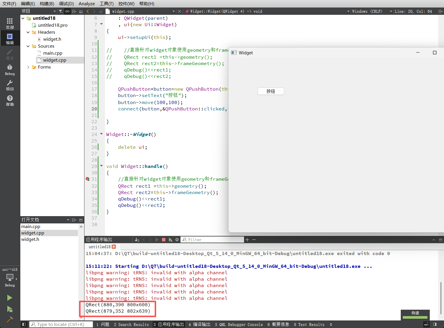 运行上述代码后,控制台输出的结果显示geometry和frameGeometry的数值完全一致。这是一个极其重要的机制特性:在构造函数执行阶段,Widget对象虽然已被创建,但尚未显示(show),也未被操作系统窗口管理器(Window Manager)装饰。
