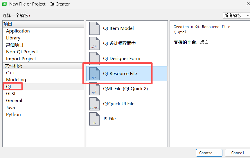 选择"Qt"分类下的"Qt Resource File"。