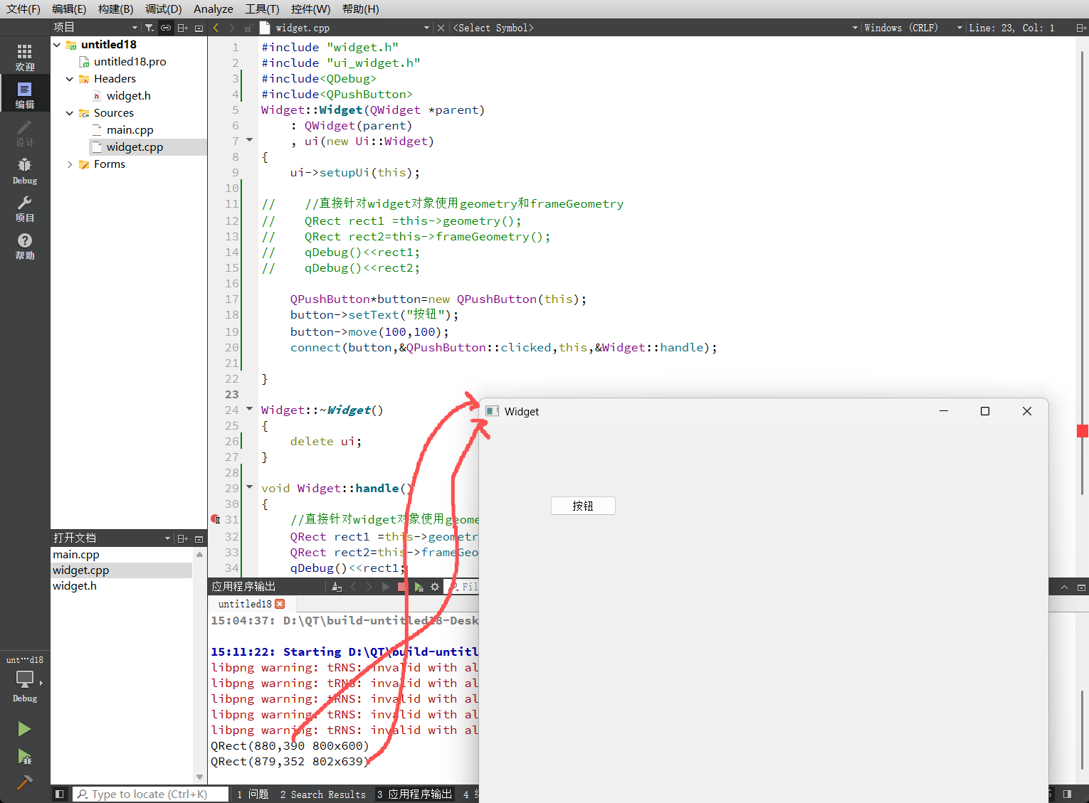 当点击按钮触发槽函数时,控制台输出显示了差异。frameGeometry的坐标(X, Y)通常比geometry更小(因为原点在左上角,包含边框的起始点更靠左上),而宽度和高度则更大。这证明了窗口管理器已经成功添加了装饰框,并且Qt能够正确读取到底层系统的窗口度量信息。