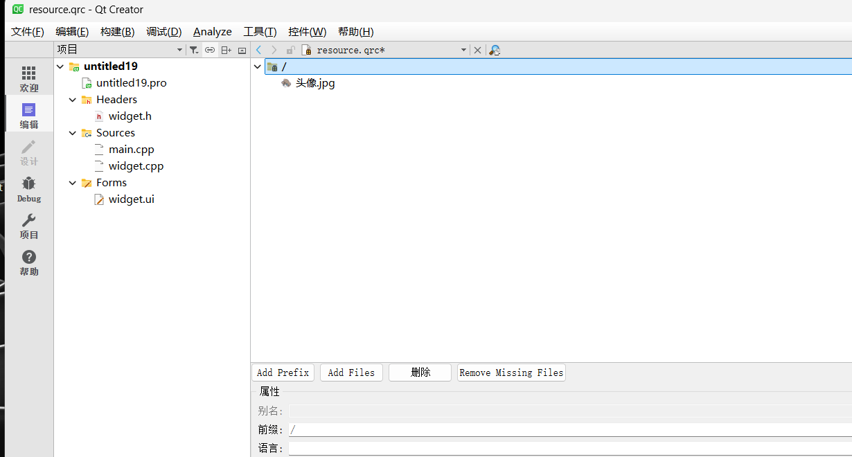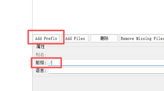 点击"Add Prefix"(添加前缀)。前缀是Qt资源系统内部的虚拟目录结构,用于对资源进行逻辑分组,并非物理路径。通常为了简便,将其设置为根目录/。
