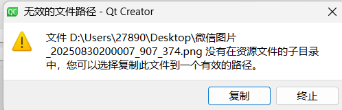 此时系统会进行路径检查。Qt要求添加到qrc中的资源文件必须位于.qrc文件所在的同级目录或其子目录中。如果文件位于项目目录之外,会弹出错误提示。