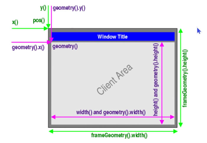 - geometry(): 指的是用户区(Client Area)的矩形区域。它不包含窗口边框(Title bar)和标题栏,仅包含开发者在界面设计器中放置控件的区域。