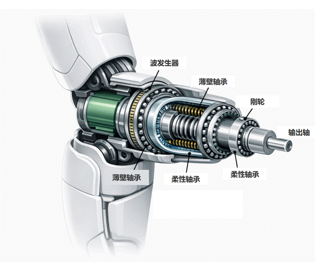 波发生器:输入端核心部件,通常由"凸轮+薄壁轴承"组成(分为单波、双波两种,人形机器人常用双波发生器,啮合齿数更多),高速旋转时迫使柔性轮产生周期性椭圆形变;