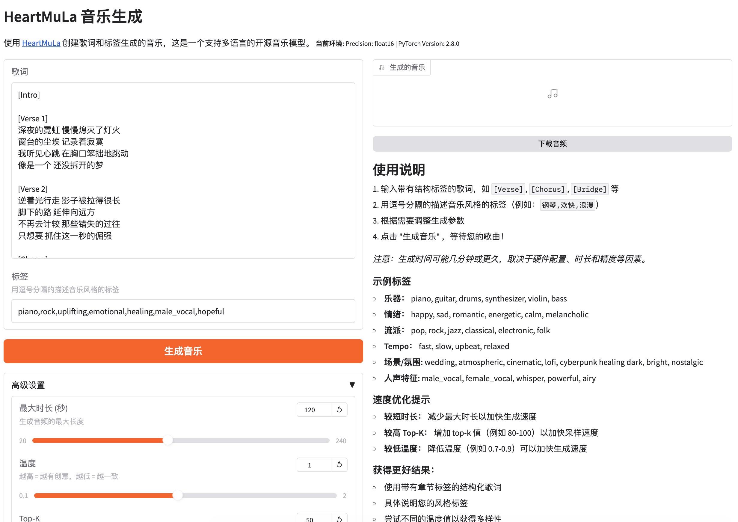 HeartMuLa 是一个强大的音乐创作工具,支持多种音乐风格和流派,让你能够轻松创作、编辑和生成音乐作品,。