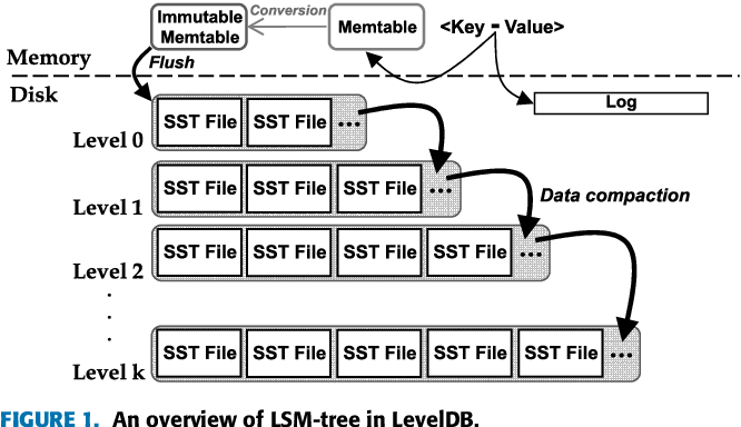 日志结构存储是一种设计哲学,而**日志结构合并树(LSM-Tree)**则是这一哲学下最经典、也最成功的工程实现之一。在 LSM-Tree 中,系统通常维护如下层级结构(此处我引用LevelDB的实现架构图进行参考):