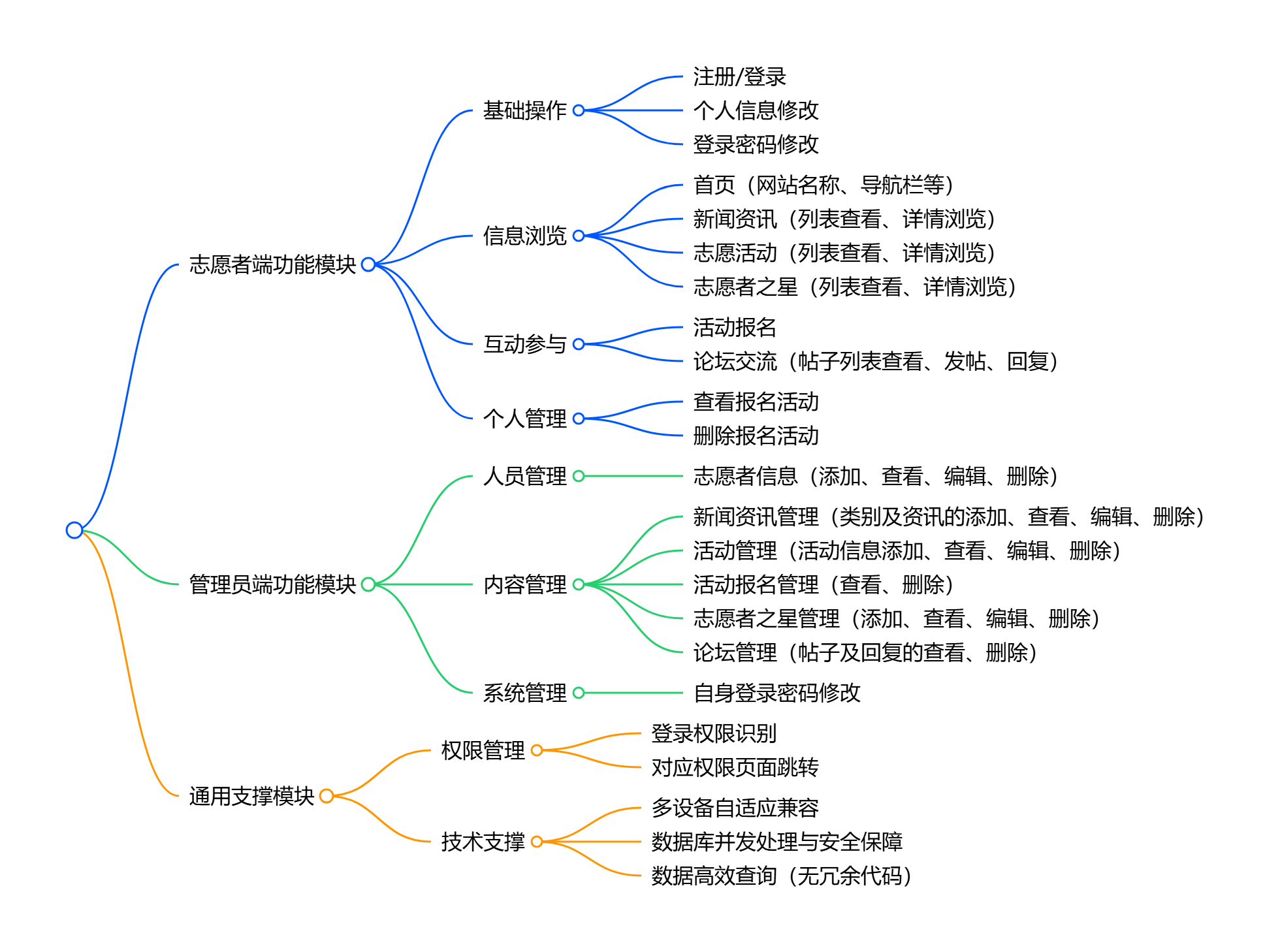 该志愿者公益网站基于 B/S 架构,以 PHP、MySQL 等为技术支撑,分志愿者和管理员两类权限,核心功能如下: