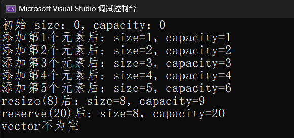 cout << "reserve(20)后:size=" << vec.size() << ",capacity=" << vec.capacity() << endl;