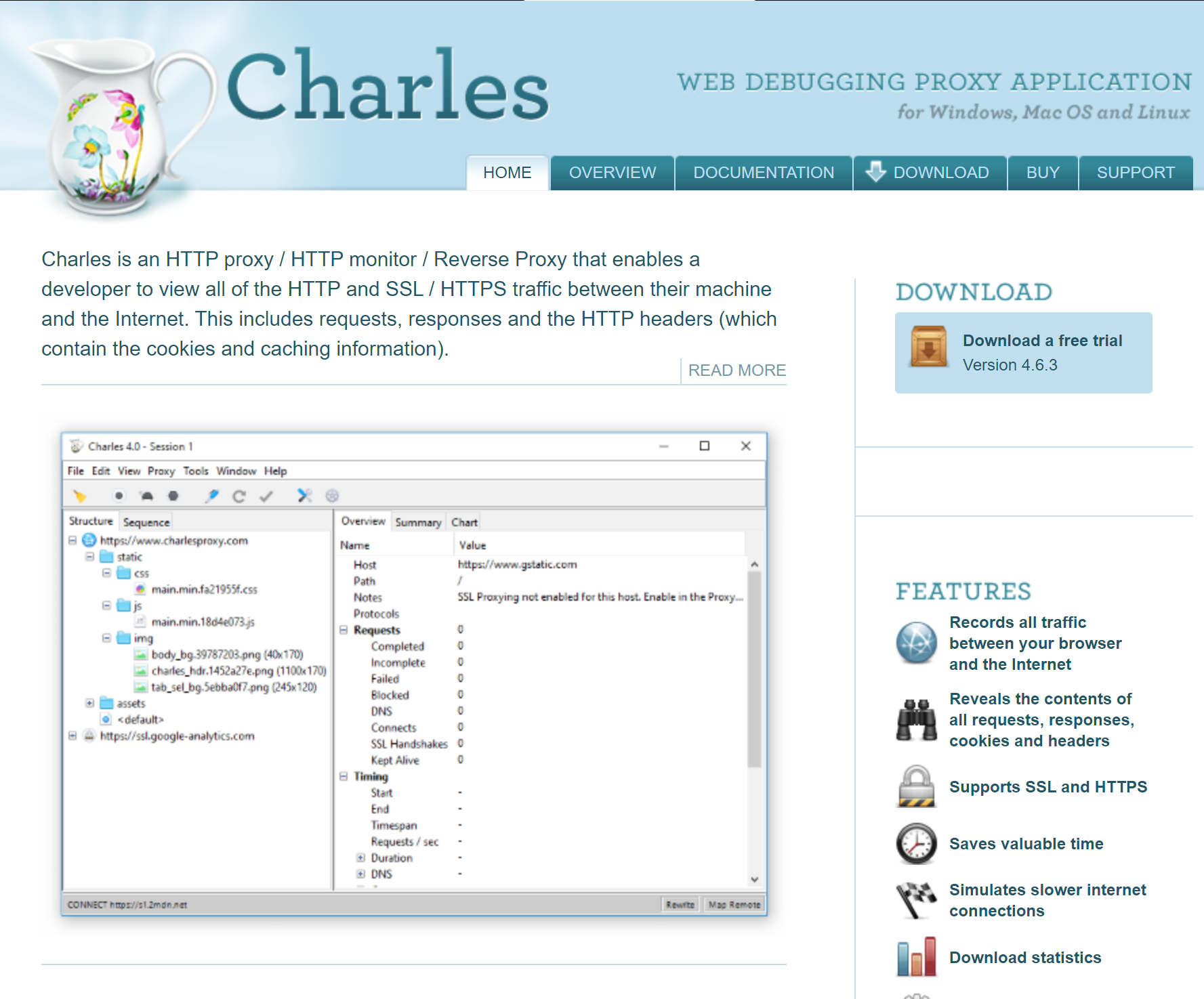 Charles是一个HTTP代理服务器,HTTP监视器,反转代理服务器,当浏览器连接Charles的代理访问互联网时,Charles可以监控浏览器发送和接收的所有数据。它允许一个开发者查看所有连接互联网的HTTP通信,这些包括request,response和HTTP headers(包含cookies与caching信息)。