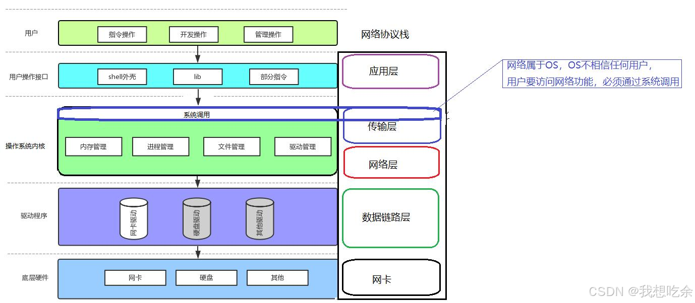 网络协议栈是贯穿整个体系结构的,在应用层、操作系统层和驱动层各有一部分。当我们要通过网络协议栈进行通信,必定调用的是传输层提供的系统调用,来进行的网络通信。