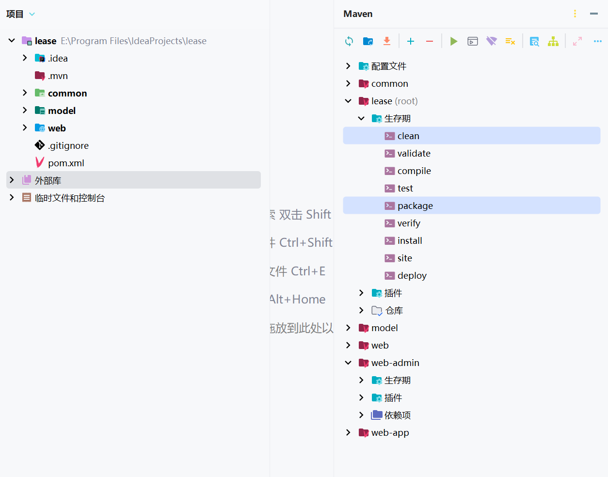 使用 IDEA 的 maven 插件对项目进行打包,完成后,在web-admin 和web-app 模块的target目录下找到web-admin-1.0-SNAPSHOT.jar和web-app-1.0-SNAPSHOT.jar。