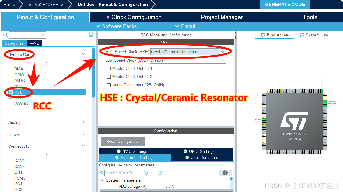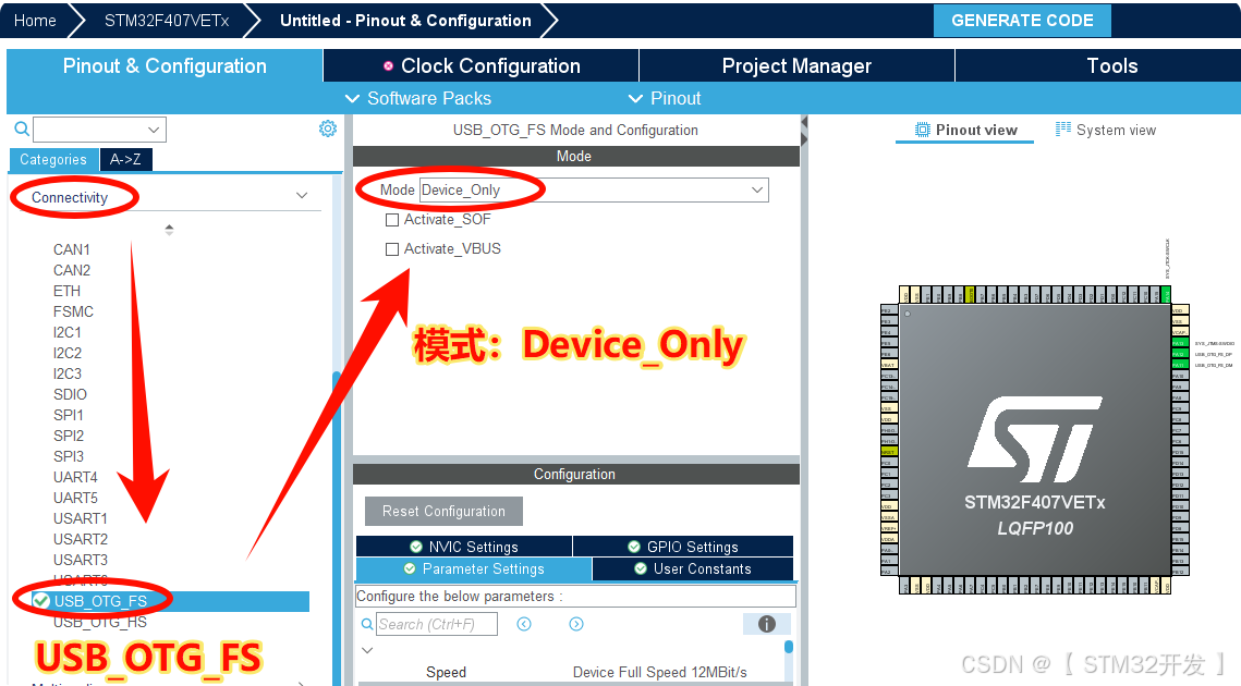 在 Pinout 视图中找到PA11(D-)、PA12(D+),它们会被自动选中;