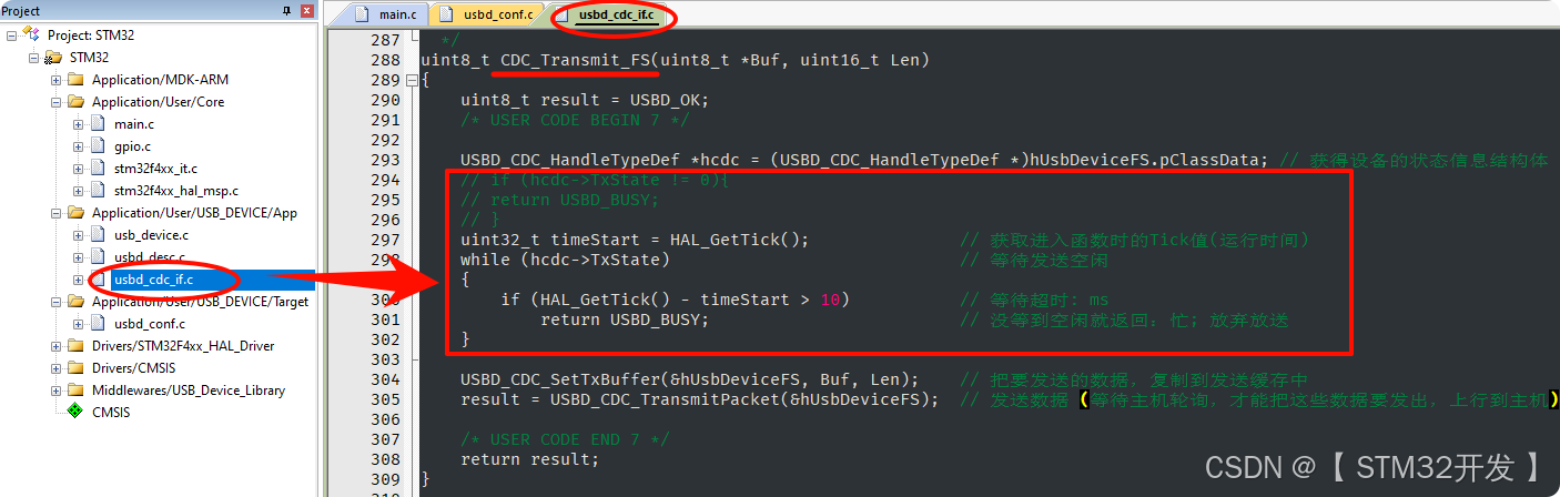 usbd_cdc_if.c :用户接口层,包含发送、接收、控制回调函数;