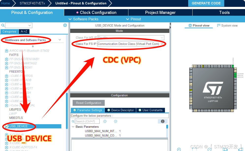 在 Middleware 栏选择 USB_DEVICE ;
