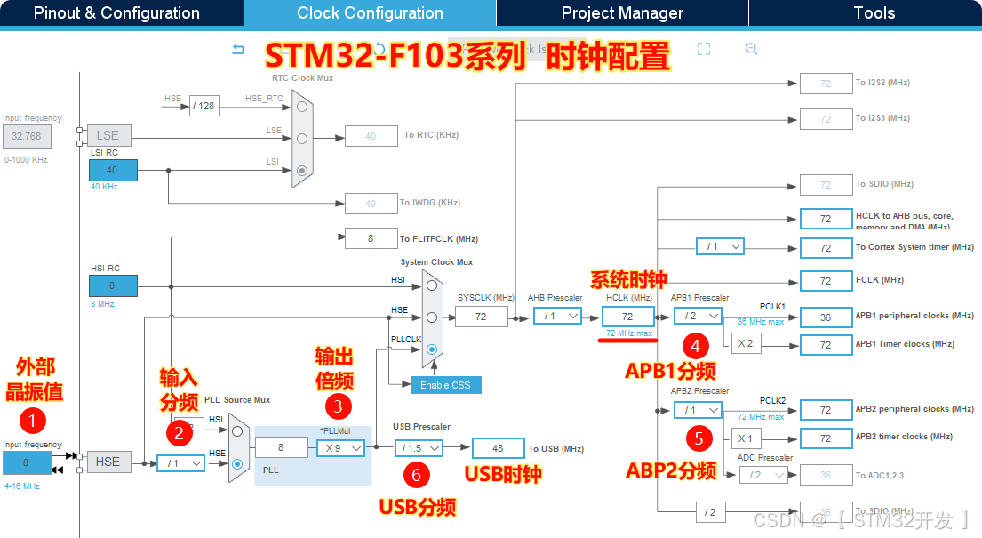 如果使用外部晶振(HSE=8MHz),可通过PLL倍频得到72MHz系统时钟,并用分频器输出48MHz给USB;