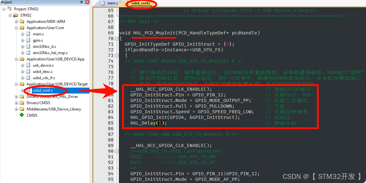 检查USB的DP(PA12)和DM(PA11)是否配置为复用功能:GPIO_InitStruct.Pin = GPIO_PIN_11 | GPIO_PIN_12; GPIO_InitStruct.Mode = GPIO_MODE_AF_PP; // 复用推挽 GPIO_InitStruct.Alternate = GPIO_AF10_USB; // 复用功能号 -