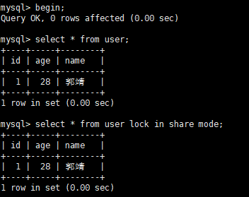 | - | - | select lock in share mode 当前读 age=28 | select * from user lock in share mode |