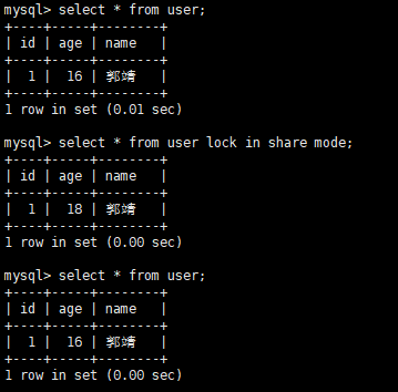 | - | - | select lock in share mode 当前读,读到 age=18 | select * from user lock in share mode |