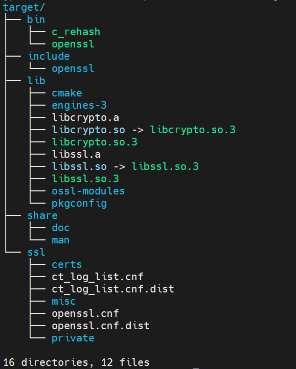 include/openssl/:头文件目录(后续编译curl等应用时需引用);lib/:库文件目录,包含libssl.so.3(SSL核心库)、libcrypto.so.3(加密算法库);bin/:工具目录,包含鸿蒙PC版openssl可执行文件(用于验证库可用性)。