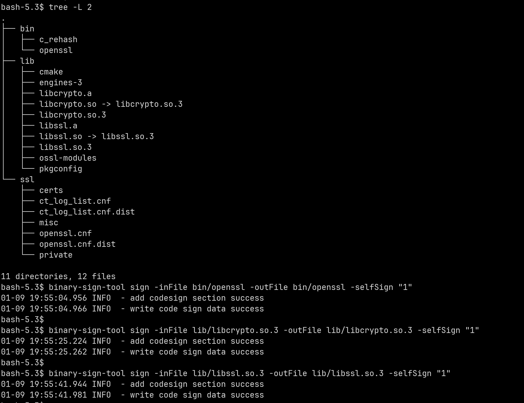 target目录下的bin/openssl、lib/libssl.so.3、lib/libcrypto.so.3拷贝到鸿蒙PC上; - 自签名(鸿蒙PC要求可执行文件签名):对拷贝的文件(可执行程序和动态都需要)进行自签名。