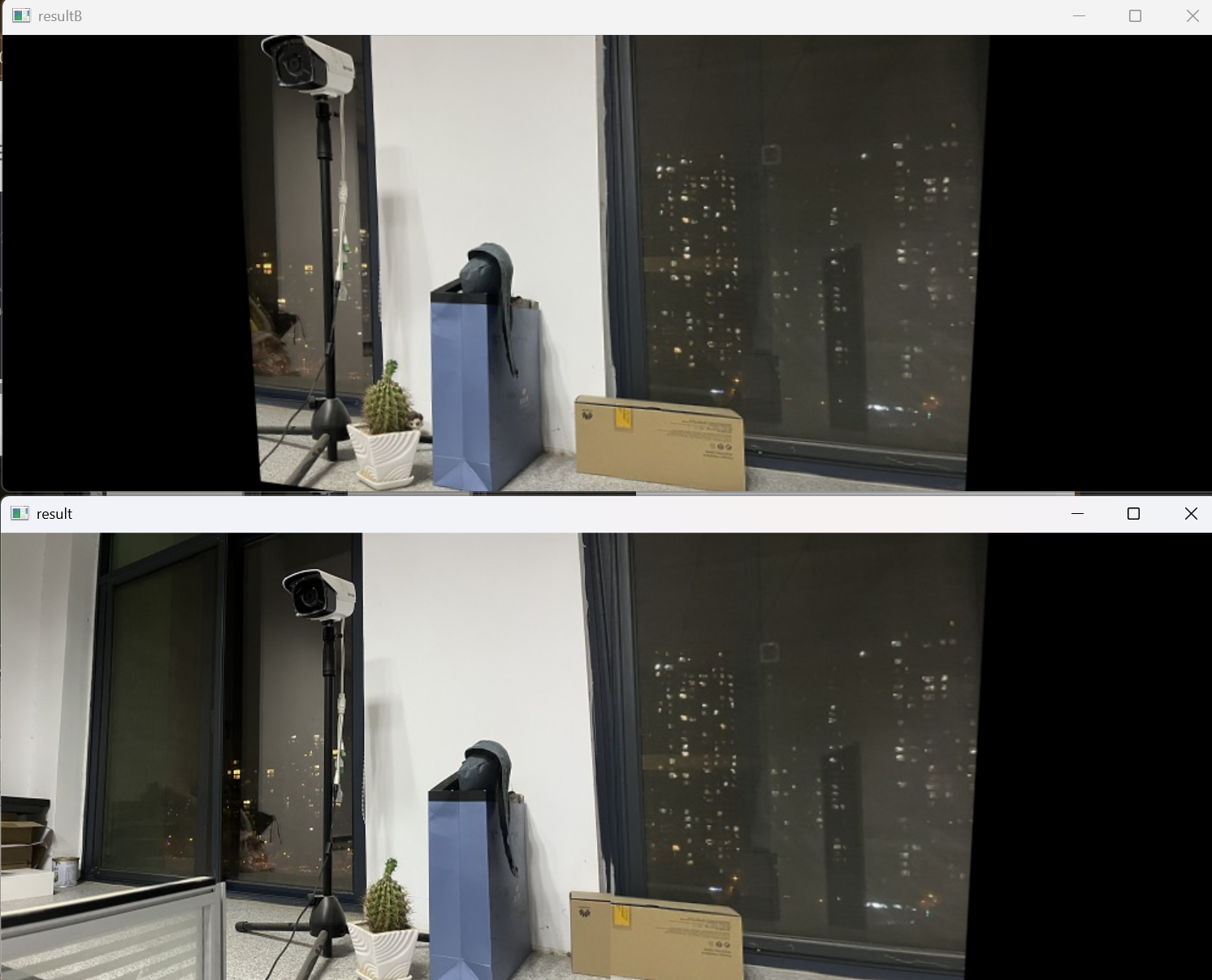展示you图经过透视之后的变化以及最后拼接成功的结果。我们能看出还是有拼接痕迹的,就比如纸箱处。